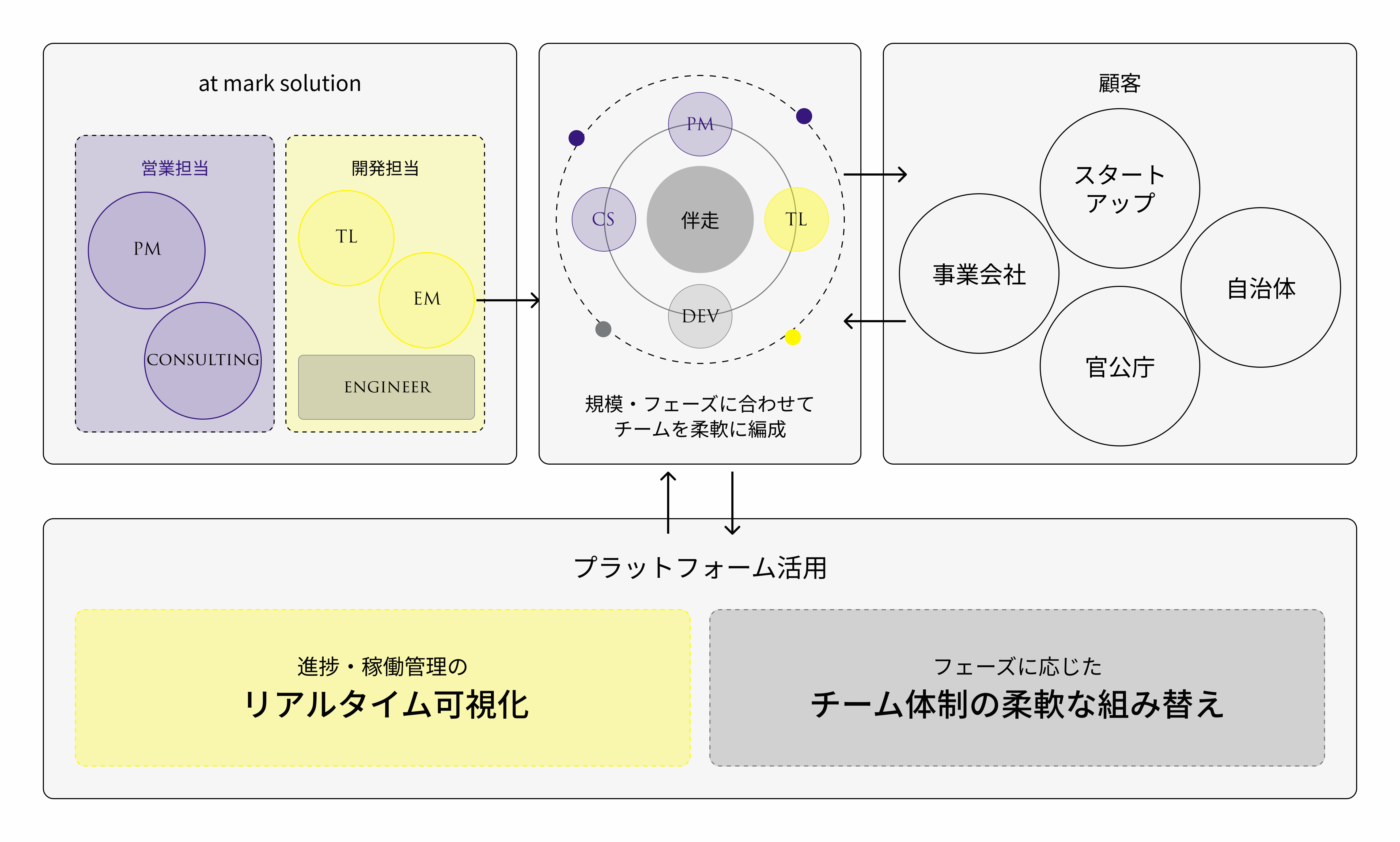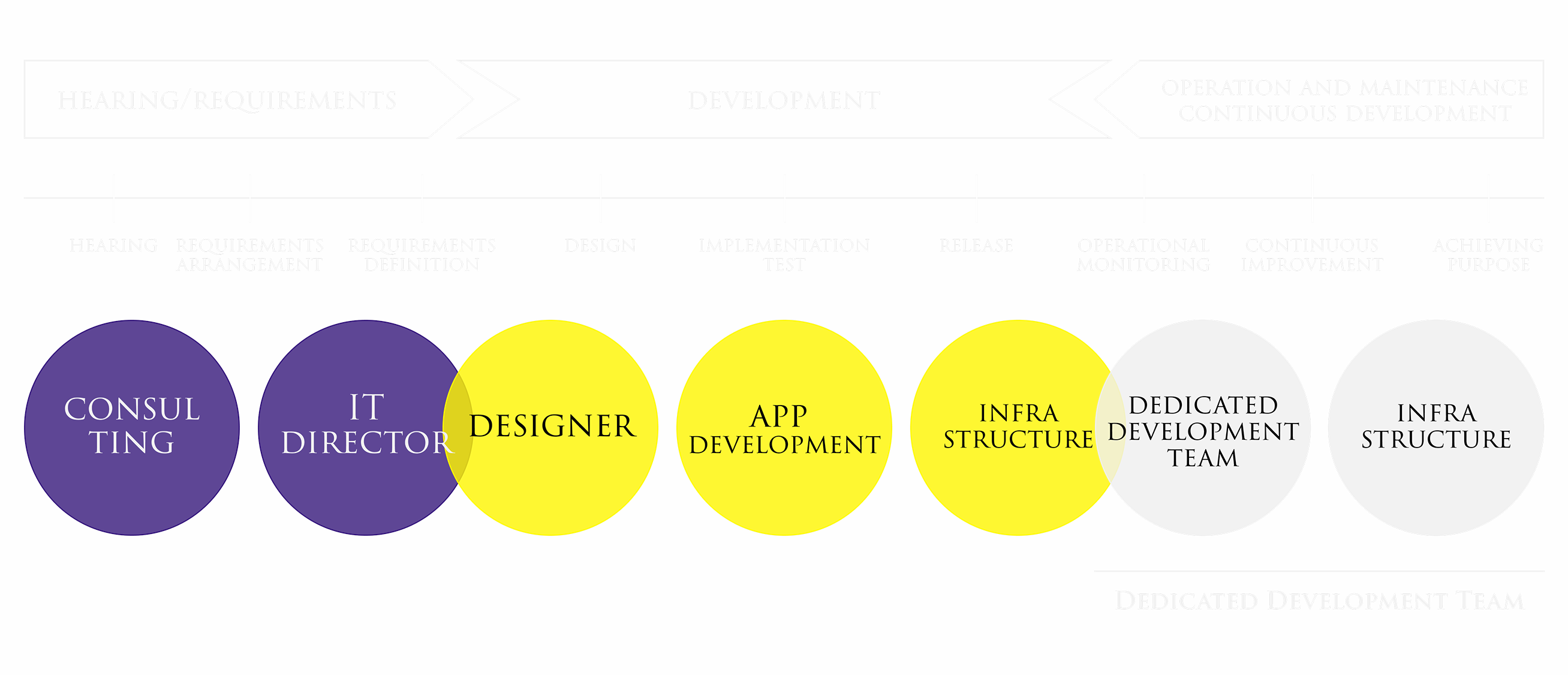ヒアリングから要件定義、設計・開発・リリース、そしてリリース後の運用保守・継続開発まで、フェーズに応じた専門家チームが一貫して担います。 多くのプロジェクトでは、フェーズが変わるたびに依頼先の会社が変わります。コンサルが描いた絵を別の開発会社が作り、運用はまた別のベンダーへ。その度に文脈が失われ、認識のズレと手戻りが積み重なります。 私たちはひとつの会社として、最初から最後まで関わり続けます。フェーズに応じてチームの構成は変わっても、プロジェクトの文脈とゴールは変わりません。
